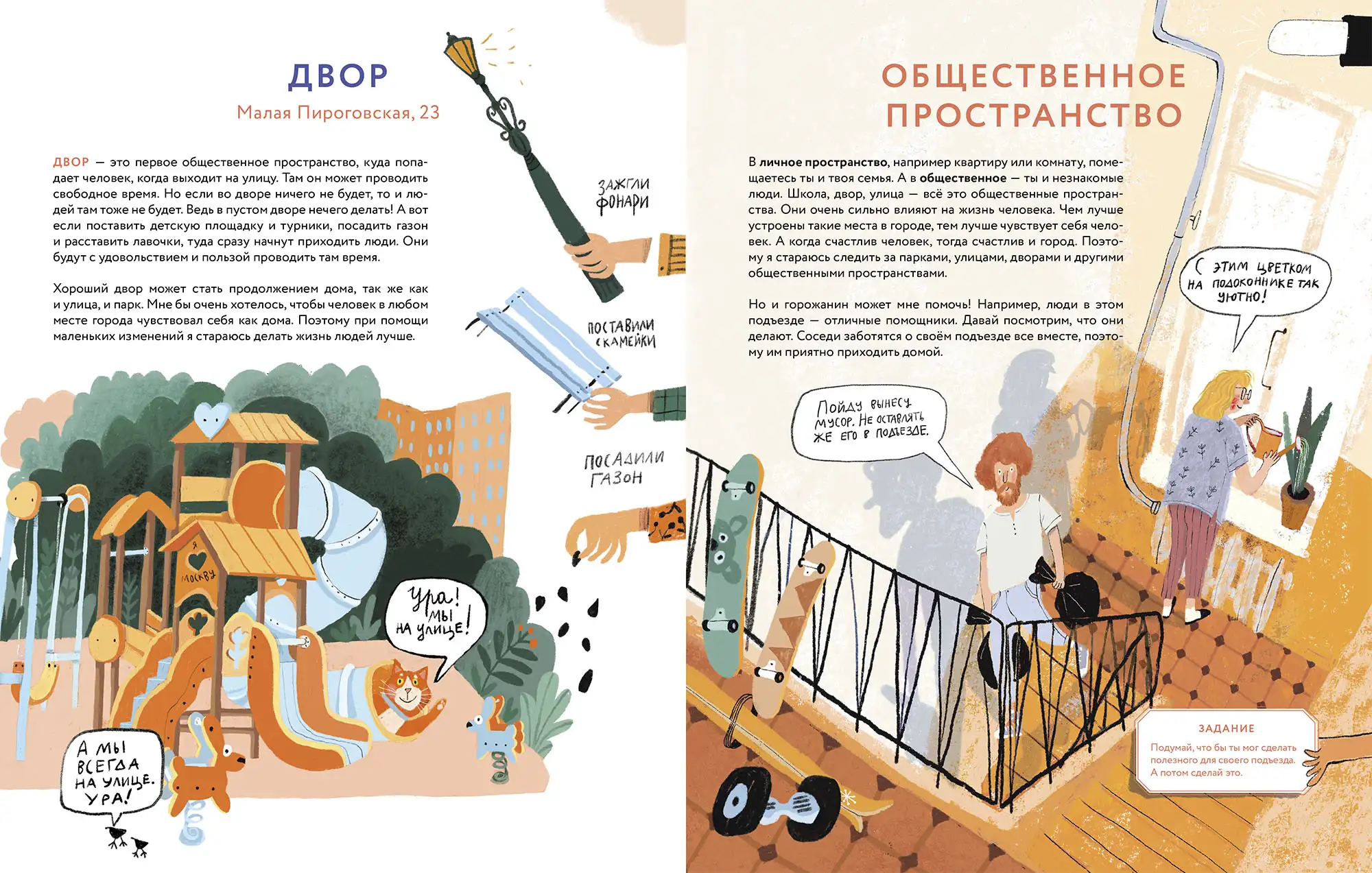 Мы вместе пойдём гулять, и ты узнаешь, зачем на улицах тротуары, что скрывается под асфальтом и почему парки — это не только красиво, но и важно для благополучия горожан. А ещё увидишь, как я выглядела много лет назад!